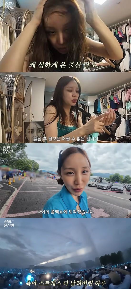 젖은 머리카락을 말리던 윤진이는 탈모가 진행된 머리 부분을 카메라에 그대로 공개하며 "지금 머리가 한 움큼씩 빠진다. (출산 후) 100일쯤 되면 머리가 이렇게 미친 듯이 빠진다"고 전했다.