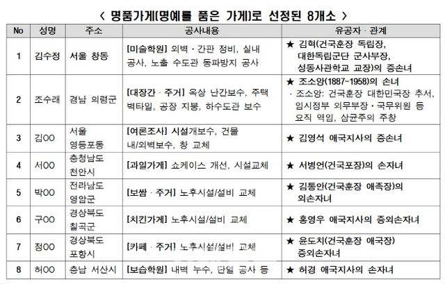 이번 1호점을 시작으로 △경남 의령 △서울 영등포 △충남 천안 △전남 영암 △경북 칠곡 △경북 포항 △충남 서산 등 전국 총 8개 지역으로 순차 진행될 예정이다. 보습학원, 과일가게, 대장간 등 다양한 업종으로 구성돼 있으며 해당 업종에 맞춘 맞춤형 리모델링이 진행된다. 명품가게 2호점은 독립운동가 조소앙 선생의 손녀 조수래 씨가 운영하는 ‘명품대장간’이다. 조소앙 선생은 건국훈장 대한민국장을 추서 받고, 임시정무 외무부장 등 요직을 역임하며 독립운동에 힘썼던 인물이다.