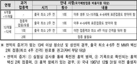 면역 증거가 없는 13세 이상 청소년 및 성인의 경우 출국 최소 4~6주 전 MMR 백신 2회 접종 완료를 권고한다.