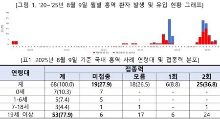 8월 9일 기준 국내 홍역 환자는 총 68명으로 작년 동기간 47명 대비 1.4배 증가했다.