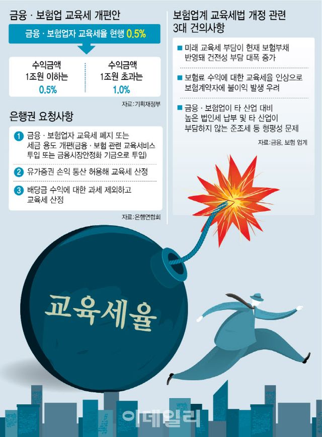 [이데일리 김형일 김나경 기자] 금융권이 정부의 교육세법 개정안에 대해 반발하고 있다. 보험료 인상이 불가피한 보험업계는 소비자 불만을 우려하고 있으며, 은행권은 세부담이 과중하다는 목소리를 내고 있다. 개정안의 핵심은 구간별 차등 세율 도입이다. 현재 교육세율은 금융권 수익에 0.5%가 일률적으로 적용되지만, 내년 법이 시행되면 1조원 초과분에는 1%가 적용된다.