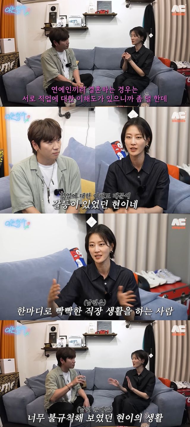 이현이는 "제가 남편이 다니는 회사에 가면 못 하겠죠. 힘들어서. 모든 사람의 일에 각자 나름의 고충이 있는데 신혼 때는 그것 때문에 많이 다투기도 하고 서로 이해가 안 되는 부분이 있었다"라고 덧붙였다.