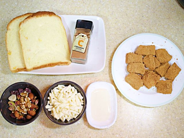 재료는 인절미, 식빵, 꿀, 견과류, 모짜렐라치즈 준비했고요.