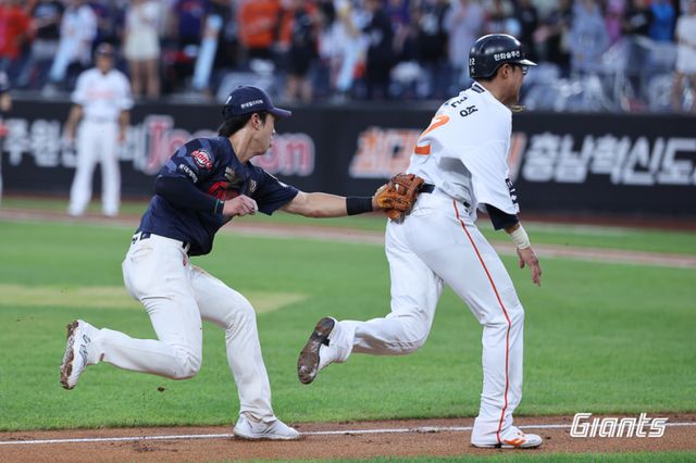 벨라스케즈는 채은성에게 안타를 맞고 희생번트를 시도하다가 강공으로 전환한 하주석에게도 안타를 맞고 1·3루에 놓였다. 이어진 김태연과의 승부에서는 3루수 앞으로 향하는 땅볼을 유도했다. 위기를 벗어날 수 있는 최상의 시나리오가 쓰였다. 실제로 손호영은 홈 송구 동작을 취했다가 그대로 주자 채은성에게 달려가 런다운을 만들었다.