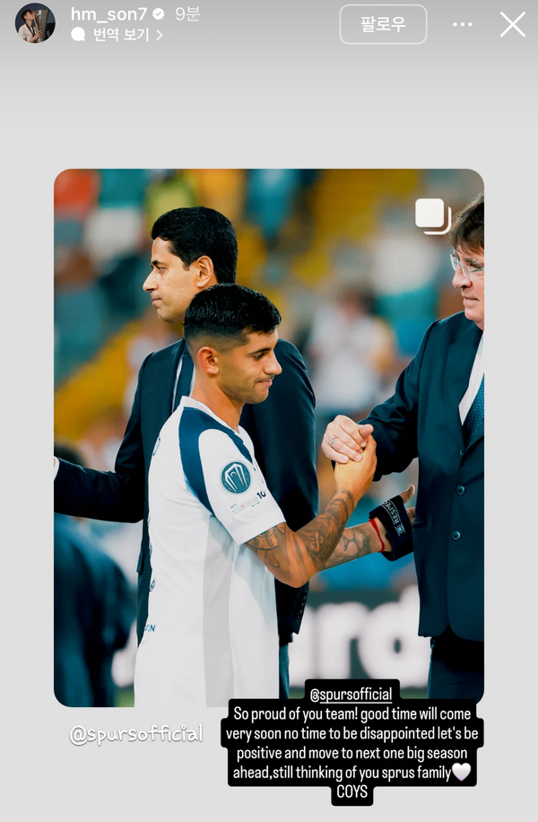 손흥민은 이 경기를 지켜보고 있었고, 경기 후 자신의 소셜미디어(SNS)를 통해 토트넘을 위로했다. 손흥민은 “토트넘이 정말 자랑스럽다. 곧 기쁜 날이 올 거다. 실망할 시간이 없다. 긍정적인 마음가짐으로 훌륭한 시즌을 향해 나아가야 한다. 여전히 토트넘 가족들을 생각하고 있다”라며 토트넘을 응원하는 문구인 ‘COYS(Come On You Spurs)’와 하얀 하트를 덧붙였다.