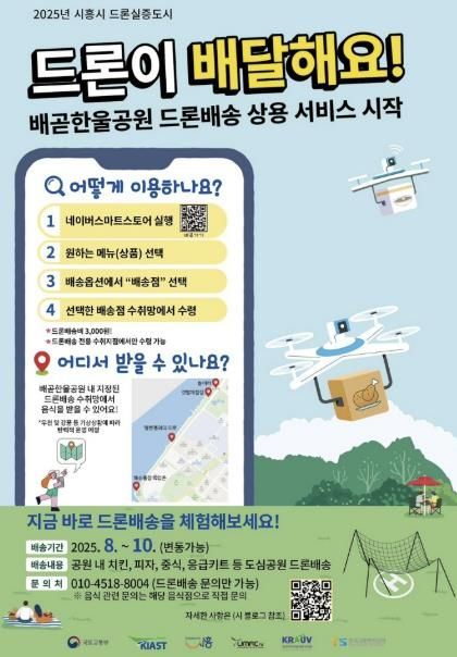 [와이뉴스] 시흥시가 국토교통부 ‘2025 드론 실증도시 구축사업’ 공모에 선정돼, 이달부터 10월 말까지 배곧한울공원 일대에서 드론을 활용한 배송 실증사업에 본격 착수한다. 이번 사업은 시흥시가 국비 5억 원을 확보해 추진하는 드론배송 상용화 사업으로, 공원을 찾는 시민들이 드론으로 배달되는 음식을 직접 받아볼 수 있는 체감형 서비스다.