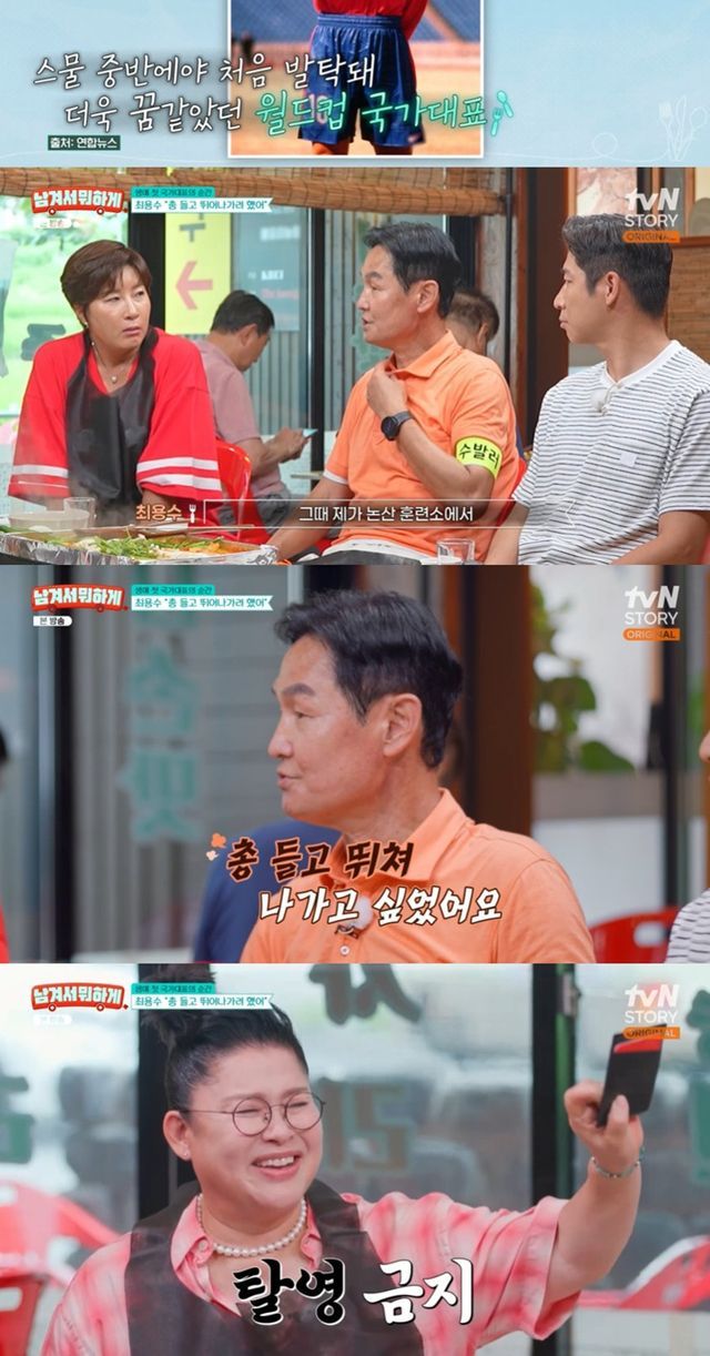 최용수는 "그때 제가 논산 훈련소에서 (선발) 통보를 받았다. 정말 총 들고 뛰쳐 나가고 싶었다. 그때 군대에서 막 훈련하고 있는데 차출 통보를 받으니"이라며 아찔한 입담을 뽐냈다.