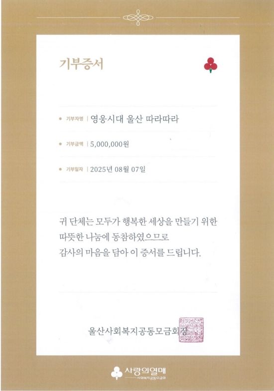 한편, '영웅시대 with HERO 울산 따라따라'는 2020년 창립된 75명 규모의 팬클럽이다. 이들은 울산 사랑의열매 '리더스클럽' 및 '착한팬클럽' 1호로, 이번 기부를 포함해 현재까지 누적 기부액은 5,244만 원에 달한다.