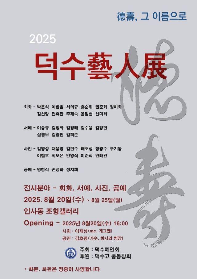 [파이낸셜경제=김영란 기자] 덕수고등학교(구,덕수상고) 동문 예술인들의 모임인 '덕수 예인회(회장 권준화)' 주관으로 8월 20일부터 25일까지 '2025 덕수 예인전'을 인사동 조형갤러리에서 전시회를 개최한다.