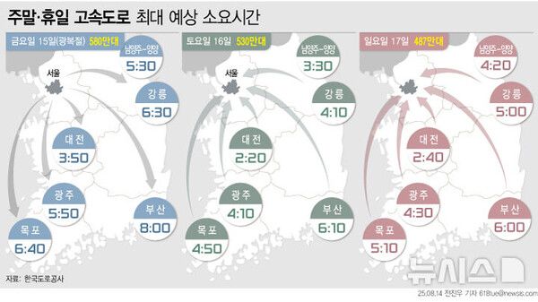 뉴시스 보도에 따르면, 14일 한국도로공사의 연휴 교통량 전망에 따르면 광복절인 오는 15일 전국 교통량은 580만대, 토요일인 16일은 530만대, 일요일인 17일은 487만대로 예측됐다.