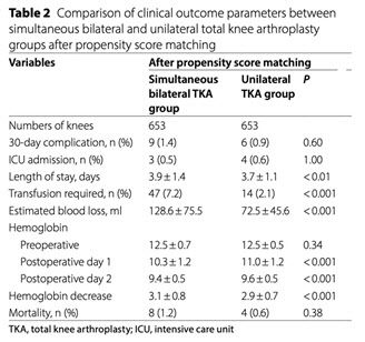 반면, 양측 수술군은 평균 입원 기간이 길고(3.9일 vs 3.7일, p<0.01), 수혈률(7.2% vs 2.1%, p<0.001)과 출혈량(128.6ml vs 72.5ml, p<0.001)이 더 높았으며, 헤모글로빈 감소 폭(3.1g/dL vs 2.9g/dL, p<0.001)이 더 컸다.