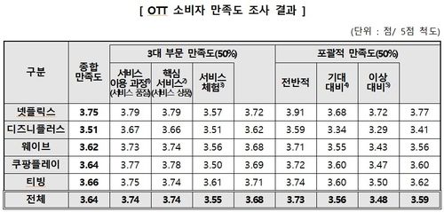 조사 결과 5개사의 종합 만족도는 평균 3.64점(5점 만점)으로, 넷플릭스가 3.75점으로 가장 높았다. 티빙은 3.66점, 쿠팡플레이가 3.64점, 웨이브가 3.62점으로 뒤를 이었고 디즈니플러스는 3.51점을 기록해 가장 낮았다.