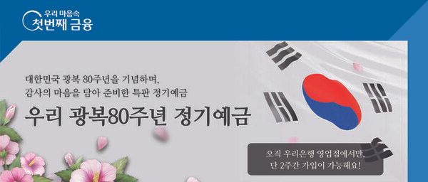 우리은행은 광복 80주년을 기념해 '우리 광복80주년 정기예금'을 출시한다고 14일 밝혔다.