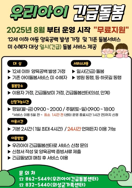 ‘우리아이 긴급돌봄’은 의성군 자체사업으로, 만 12세 이하 자녀를 둔 맞벌이 가정이나 기존 아이돌봄서비스를 이용하지 않는 가정을 대상으로 긴급돌보미가 ▲일시(긴급) 돌봄서비스 ▲병원 동행 ▲등·하굣길 동행 서비스를 제공하는 사업이다.