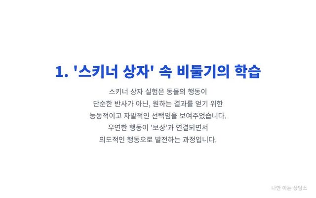 이 실험은 동물의 행동이 단순히 반사적인 반응(고전적 조건형성)이 아니라, 원하는 결과를 얻기 위한 능동적이고 자발적인 선택의 산물임을 명확히 보여주었습니다.