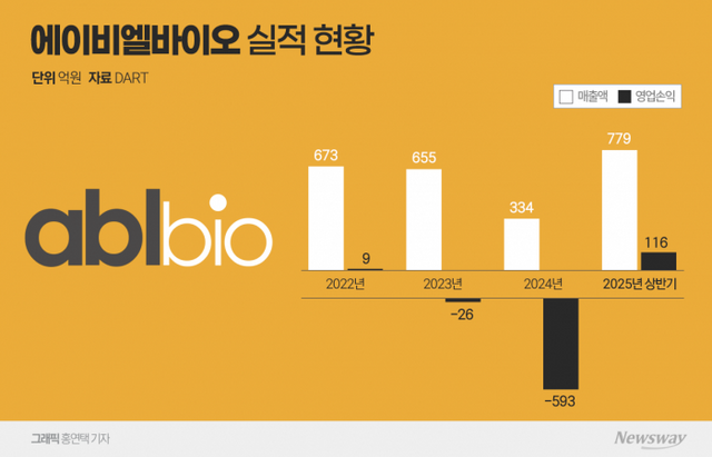 14일 금융감독원 전자정보시스템에 따르면 에이비엘바이오는 2분기에 매출 757억원과 영업이익 407억원을 달성했다. 이는 분기 기준 역대 최고 기록으로 올 상반기 누적 매출(779억원)은 이미 지난해 연간 매출(334억원)을 훌쩍 뛰어넘었다. 영업이익도 116억원을 기록하며 흑자 전환에 성공했다.