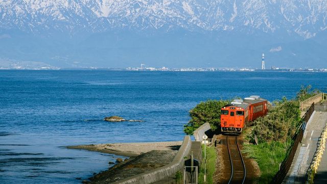 다테야마 산맥을 배경으로 도야마만을 지나는 붉은색 지방열차. / amri48-shutterstock.com
