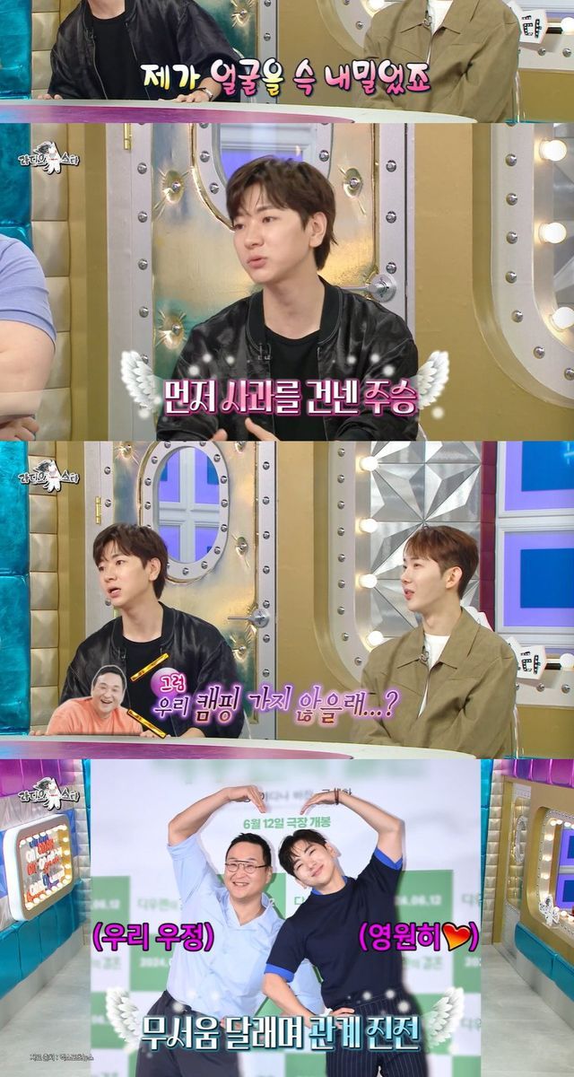 이런 이주승의 사과에 구승환은 다음날 캠핑을 제안, 이주승은 "내일 캠핑 한번 같이 가자고 해서 바로 갔다. 거기서 담력 훈련도 하고"라며 "무서워서 울더라. 그래서 위로해 주면서 친해졌다"고 덧붙였다.