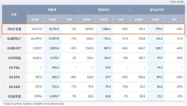 GS칼텍스는 전년 동기 대비 15% 감소한 매출 10조7240억원을 기록했으며 영업손실 2575억원으로 적자 전환했다. GS에너지는 매출 1조1789억원, 영업이익 3435억원으로 전년 동기 대비 각각 21%, 41% 감소한 실적을 나타냈다.