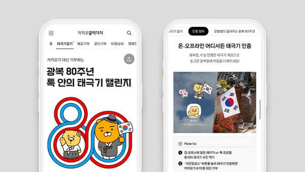 카카오 기부 플랫폼 카카오같이가치에서 진행된 광복 80주년 기부 캠페인이 목표(기부 20만건 달성)를 조기 달성했다. 카카오는 목표치를 상향한 가운데 이 목표도 달성 가능할 전망이다.