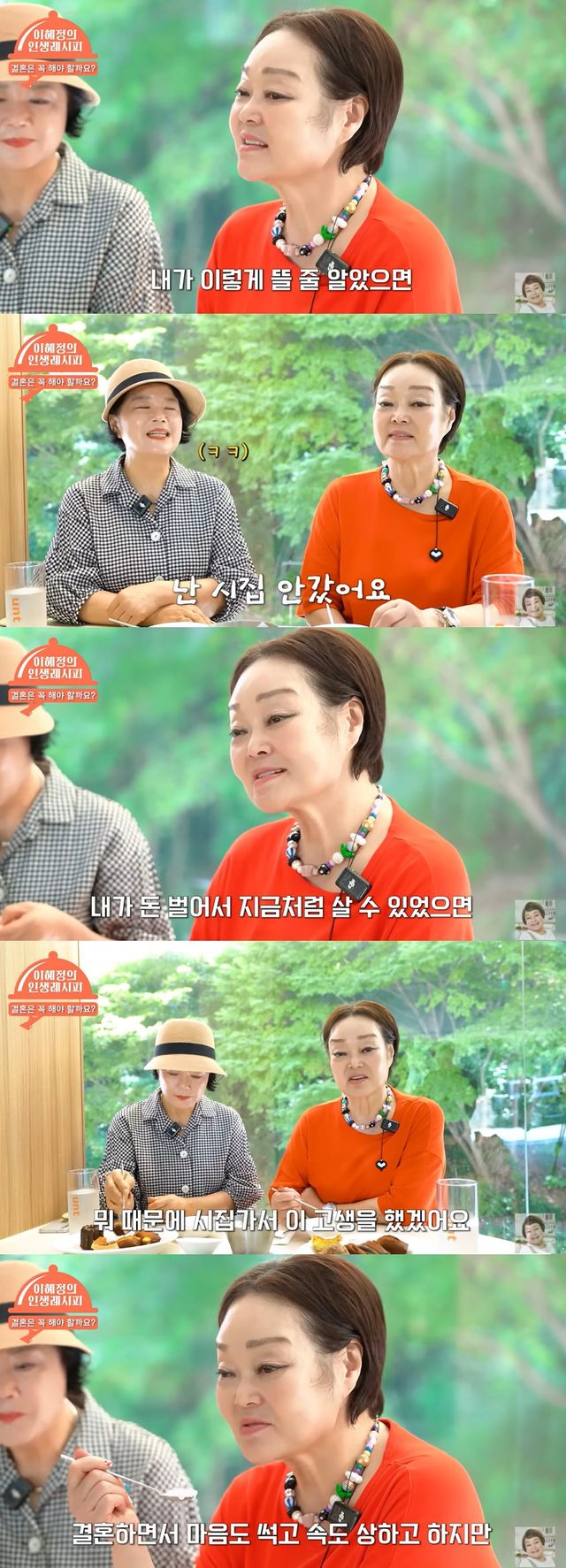 이혜정은 "내가 돈 벌어서 지금처럼 살 수 있었으면 뭐 때문에 시집가서 이 고생을 했겠냐. 그런데 결혼하면서 마음도 썩고, 속도 상하고 하지만 자식 낳아서 기르면서 누리는 기쁨은 부럽지 않을까"라고 덧붙였다.