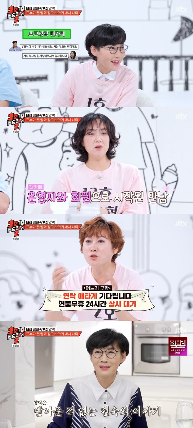 팽현숙은 "시즌 1 이후 개설된 최양락, 팽현숙의 팬카페 '초코양락'을 딸이 운영했다. 우리 부부 방송 나온 걸 보고 (사위가) '부모님이 너무 재밌으세요. 팬이세요'라고 하고, 딸이 '사랑해 주셔서 감사합니다' 해서 시작됐다"라고 말해 놀라움을 안겼다.