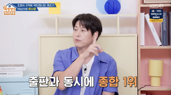 최근 출간한 요리책은 발매 직후 종합 1위에 오르며 한 달이 지난 현재까지도 3위를 유지 중이다. 이미 11쇄를 찍은 상황에 MC들은 “인세만 1억 원이 넘었을 것”이라고 추측했고, 류수영은 이를 부정하지 않았다. 그는 “책 발간까지 4년이 걸렸다. 레시피에 오류가 있으면 민망하고 죄송할 것 같아 꼼꼼히 검증하는 데 시간이 많이 걸렸다”고 설명했다.