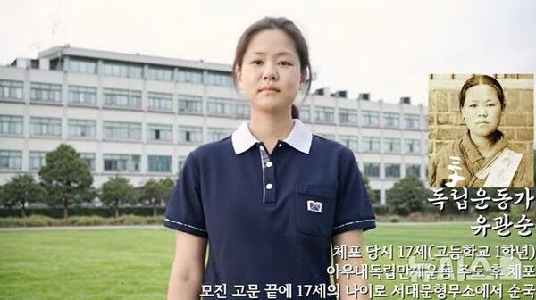 #교복을 입고 환하게 웃는 유관순 열사의 표정이 화면 안에 가득 담긴다. 배경은 형무소가 아닌 평범한 고등학교다. 옷 역시 거친 수형복이 아닌 교복을 입고 있다. 여느 고등학생과 다를 바 없는 유관순 열사의 이 모습은, 광복 80주년을 맞은 오늘날, 인공지능(AI) 기술로 복원해 낸 결과물이다.