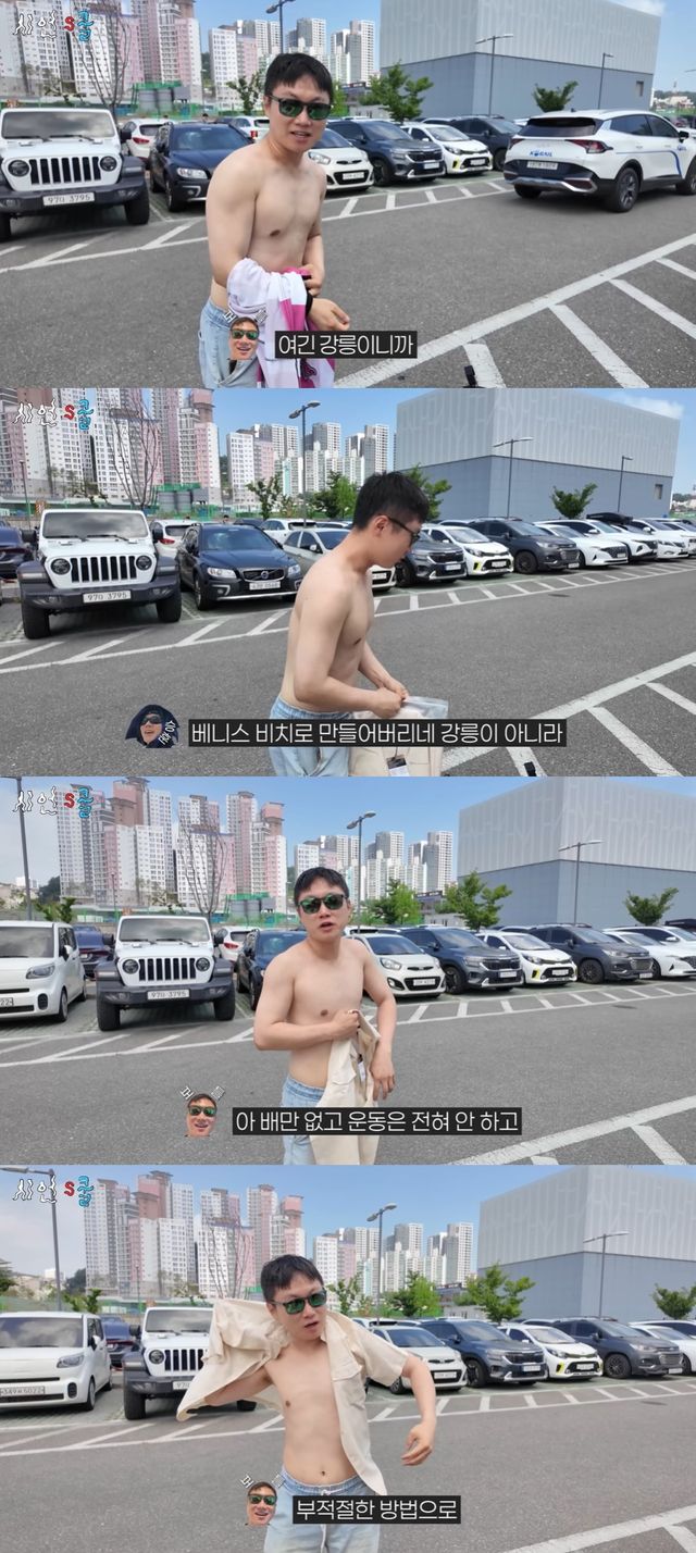 빠니보틀의 모습을 본 이승훈은 "강릉이 아니라 베니스 비치로 만들어버리네"라고 거들어 웃음을 안겼다. 이어 이승훈은 "그래도 형은 그것도 해서 몸이 또 탄탄하다. 은근히 배가 없다"라고 말했다.