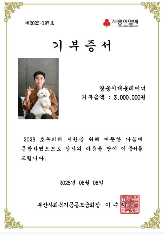최근 임영웅 팬클럽 '영웅시대 웅테이너'는 지난 8일 부산사회복지공동모금회에 호우 피해 복구 지원을 위한 성금 300만 원을 전달했다고 밝혔다.