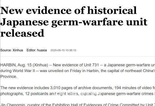 보도에 따르면 이날 중국 헤이룽장성 하얼빈의 ‘일본군 731부대 범죄증거전시관’은 일본 공식 기관에서 나온 범죄 증거와 역사 자료다. 2018년 일본 현지에서 수집한 731부대 관계자 구술 증언, 일본 일반인으로부터 확보한 범죄 관련 자료 등 세 부류의 증거를 공개했다.