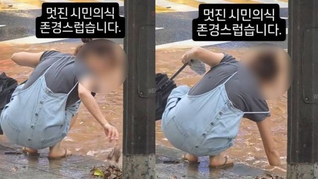 14일 SNS에는 "멋진 시민의식 존경합니다"라는 글과 함께 한 여성의 영상이 올라왔다. 영상 속 여성은 침수된 도로 옆에 쪼그려 앉아 흙탕물 속으로 손을 넣어 낙엽과 쓰레기를 꺼내고 있었다. 배수구가 막혀 빗물이 고이자 직접 손으로 치우며 배수를 돕는 모습이었다.