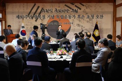 우 의장은 15일 국회 사랑재에서 열린 ‘독립운동가 후손과의 오찬’에서 “광복 80년인 오늘 후손분들을 모시게 돼 더욱 특별한 마음”이라며 “독립운동의 역사와 정신, 그 유산과 가치를 계승·발전시키는 데서 국회가 책임 있는 역할을 하는 것이 마땅하다”고 말했다.