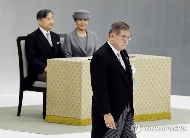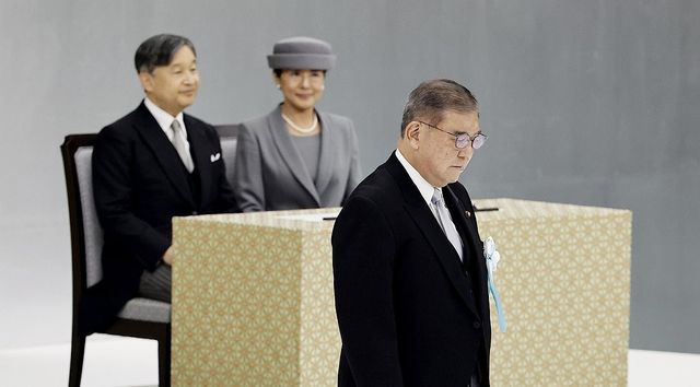 일본의 패전일인 15일 도쿄 일본 무도관에서 열린 '전국 전몰자 추도식'에 참석한 나루히토 일왕 부부와 이시바 시게루 일본 총리 모습. 이시바 총리는 이날 식사에서 "전쟁의 참화를 결단코 되풀이하지 않겠다"라며 "그 전쟁의 반성과 교훈을 이제 다시 가슴 깊이 새겨야 한다"라고 말했다. / 교도통신-연합뉴스