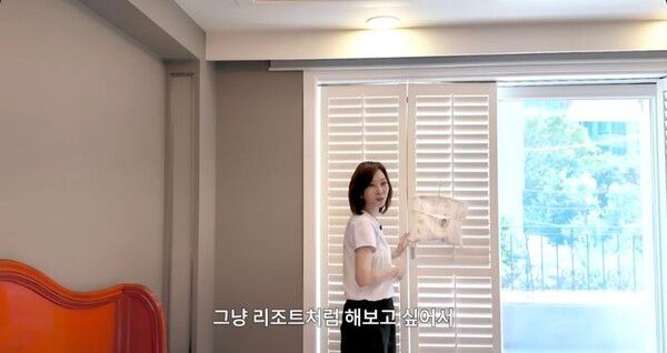 침실 옆 통창 공간에 대해 김남주는 "리조트 느낌을 내고 싶었다. 신혼 때는 여기 베란다에 선베드 두 개에 야자수 놔놓고 태닝도 했었다"고 말했다. "두 번 나갔다. 저기에 비만 샌다"고 덧붙였다.