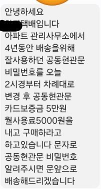 작성자인 입주민 A씨는 "아파트 입주자 대표 회의 주도로 택배기사가 공동 현관에 출입하려면 매달 5000원의 이용료를 내야 한다는 사실을 알게 됐다"고 털어놨다.