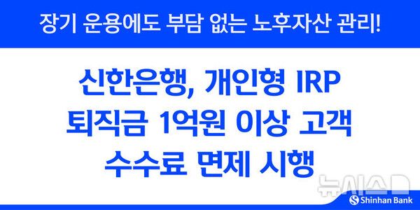 신한은행은 비대면 채널로 개인형퇴직연금(IRP) 계좌를 개설하고 퇴직금 1억원 이상을 입금하면 운용관리수수료와 자산관리수수료를 전액 면제한다고 16일 밝혔다.