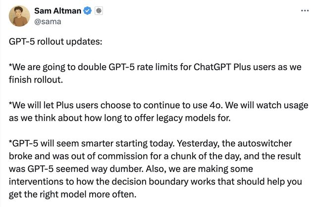 올트먼 CEO는 지난 9일 엑스(X·옛 트위터) 게시물을 통해 "(모델의) '자동전환장치'가 고장 나 사용 불가 상태여서 GPT-5가 실제보다 더 멍청해 보였다"며 "오늘부터는 더 똑똑해 보일 것"이라고 해명했다.