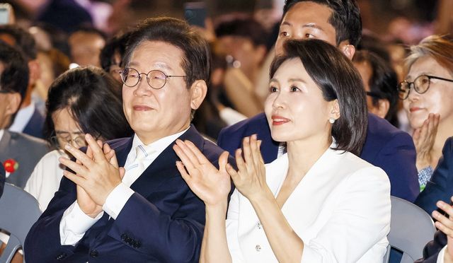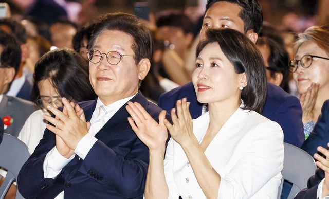 15일 서울 광화문광장에서 열린 제21대 대통령 국민임명식에 참석한 이재명 대통령과 김혜경 여사. 국민의힘은 이재명 대통령이 국민임명식에서 낭독한 '국민께 드리는 편지'에 대해 "국민을 현혹하는 말로 점철된 거짓말의 향연"이라고 비판했다. / 연합뉴스