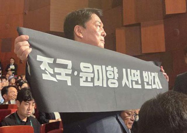 안철수 국민의힘 당대표 후보가 15일 오전 서울 종로구 세종문화회관에서 열린 제80주년 광복절 경축식에 참석해 경축사 중인 이재명 대통령을 향해 조국 전 조국혁신당 대표와 윤미향 전 의원의 사면 반대 플래카드를 들어보이며 항의하고 있다. / 안 후보 캠프 제공