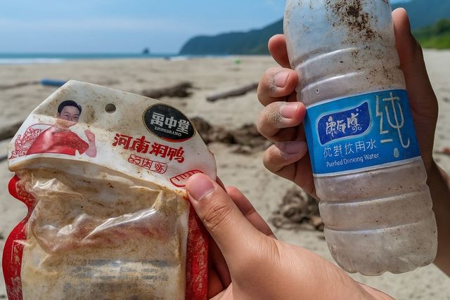 해변에서 수거한 쓰레기들의 포장지에는 중국 저장성에서 온 생수, 허난성에서 온 오리고기라고 적혀 있었다. 그중에는 북한 남포시에서 생산된 생수병도 발견됐다.