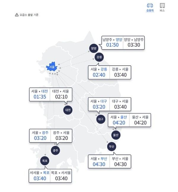 상행선은 ▲부산~서울 4시간30분 ▲대구~서울 3시간40분 ▲광주~서울 3시간20분 ▲대전~서울 2시간10분 ▲강릉~서울 3시간40분 ▲울산~서울 4시간20분 ▲목포~서울 3시간40분이다.