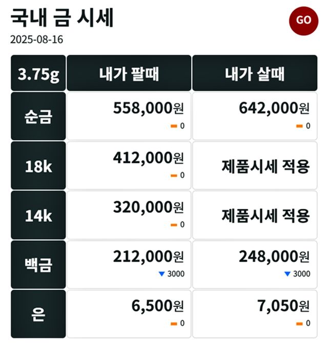 순금(24K) : 매입가 64만 2000원 / 매도가 55만 8000원