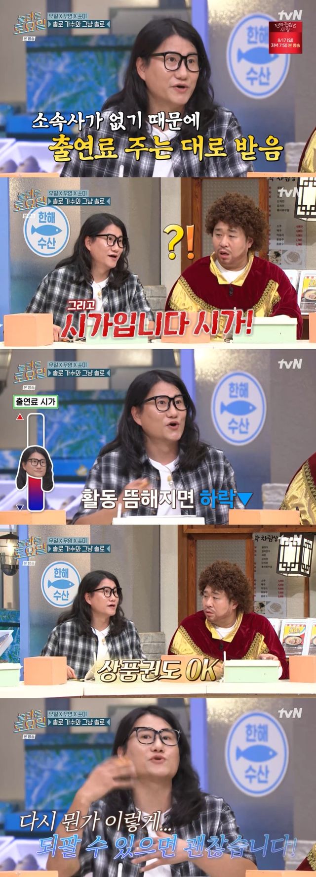 이날 임우일은 자신을 홍보하러 나왔다며 "저는 소속사가 없기 때문에 주는 대로 (출연료를) 받는다. 그리고 시가다"라는 파격 발언을 했다.