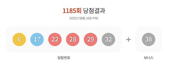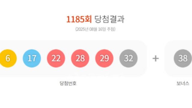 제1185회 로또복권 추첨 결과, 1등 당첨 번호는 ‘6, 17, 22, 28, 29, 32’로 결정됐다. 보너스 번호는 ‘38’이다. 이번 회차에서 1등 당첨자는 총 12명이며, 각 당첨자에게 돌아가는 금액은 23억 8869만 5125원이다.