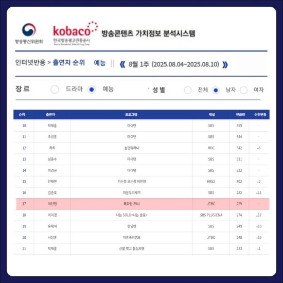 최근 방송콘텐츠 가치정보 분석 시스템(RACOI)이 발표한 2025년 8월 1주 차(8월 4일~8월 10일) 인터넷 반응 분석 출연자 순위 남자 예능 부문에 따르면, 이찬원은 JTBC '톡파원 25시'로 17위를 기록했다.