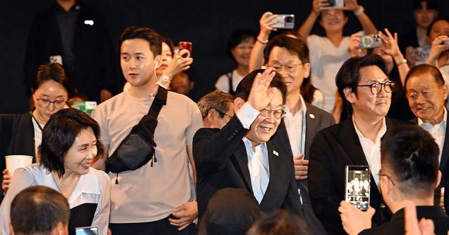 이재명 대통령과 김혜경 여사가 17일 서울 용산CGV '독립군:끝나지 않은 전쟁' 상영관에서 관객들에게 인사하고 있다. / 연합뉴스
