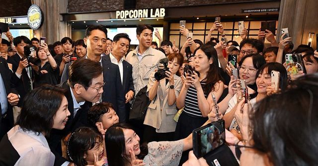 이재명 대통령이 17일 서울 용산CGV에서 '독립군:끝나지 않은 전쟁' 관람 후 시민들과 기념촬영을 하고 있다. 이 대통령은 광복 80주년을 기념해 조진웅 배우가 추천한 이 영화를 본다면서 SNS를 통해 신청한 시민들과 동반 관람을 했다. / 연합뉴스(대통령실통신사진기자단)