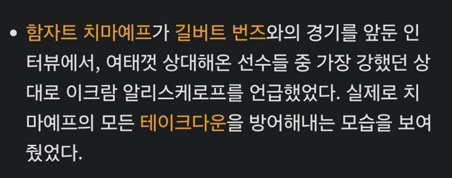 심지어 치마예프 피셜 커리어동안 상대해본 선수 중에 제일 빡셌다고 ㄷㄷㄷ
