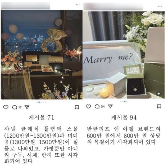 예물로 가장 많이 등장한 것은 명품 가방이었다. 총 38개의 가방 관련 게시글에서 ‘샤넬’이 19건으로 가장 비중이 높았고, 다른 예물 중에서는 ‘반클리프 아펠’ 목걸이가 13건으로 가장 많았다.
